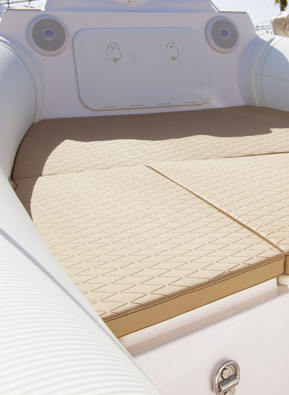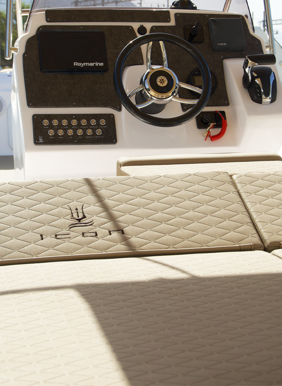 Il gommone è equipaggiato con un motore di ultima generazione da 300 cavalli, dotato di servosterzo dinamico e trim automatico. Questo motore offre elevate prestazioni, garantendo sia sicurezza che un basso consumo di carburante. Il gommone è fornito di ampie aree prendisole sia a prua che a poppa, un impianto stereo e una doccetta con acqua dolce. Grazie ai due spaziosi prendisole, l’Icon 28S è perfetto per escursioni giornaliere e brevi crociere.